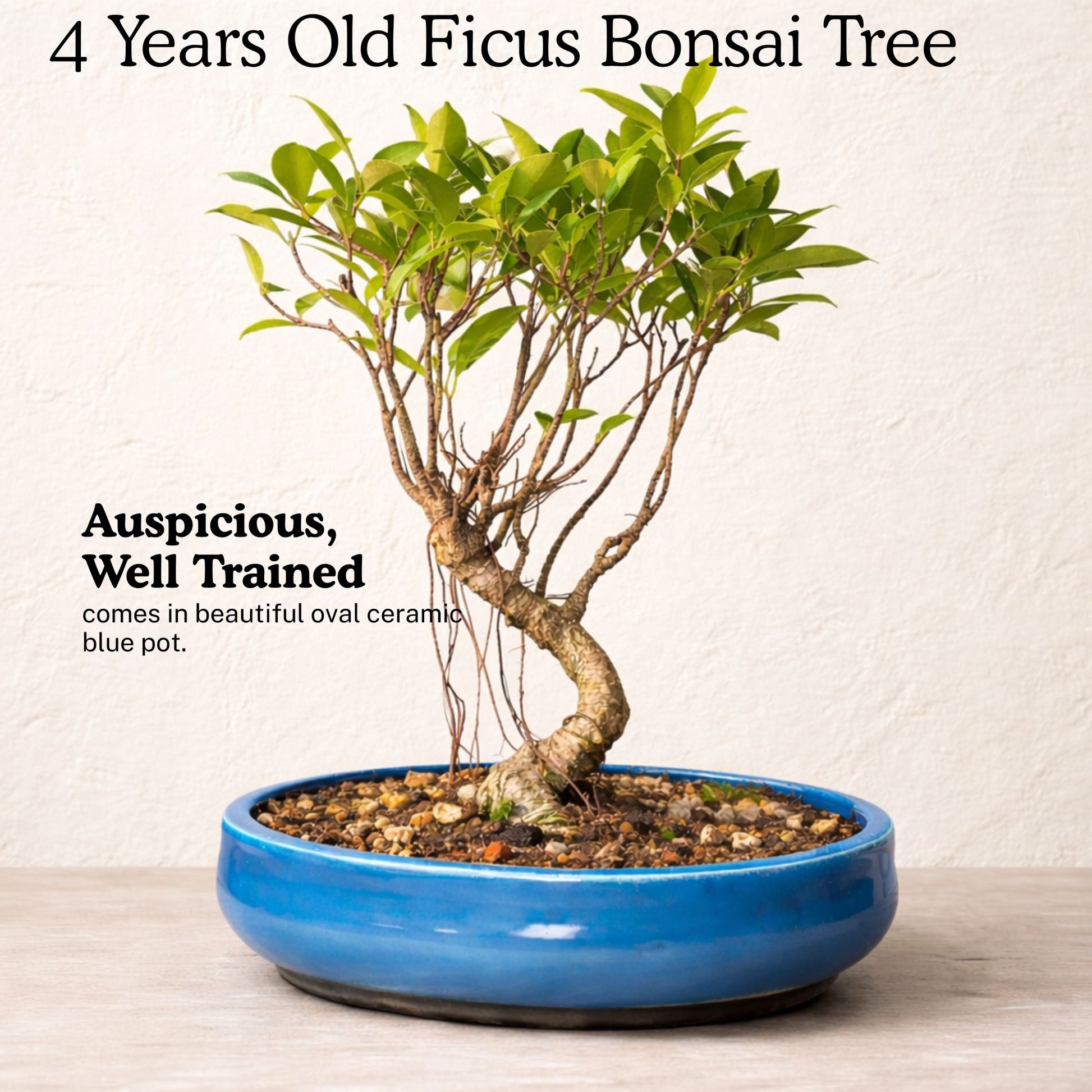 Bring home this beautiful Auspicious 4-year-old Banyan Bonsai Tree – 25 cm tall, styled in an elegant S-shaped curve and housed in a Blue Oval premium ceramic pot. Perfect for homes, offices, or as a thoughtful gift. Delivered safely with care instructions to help your bonsai thrive.